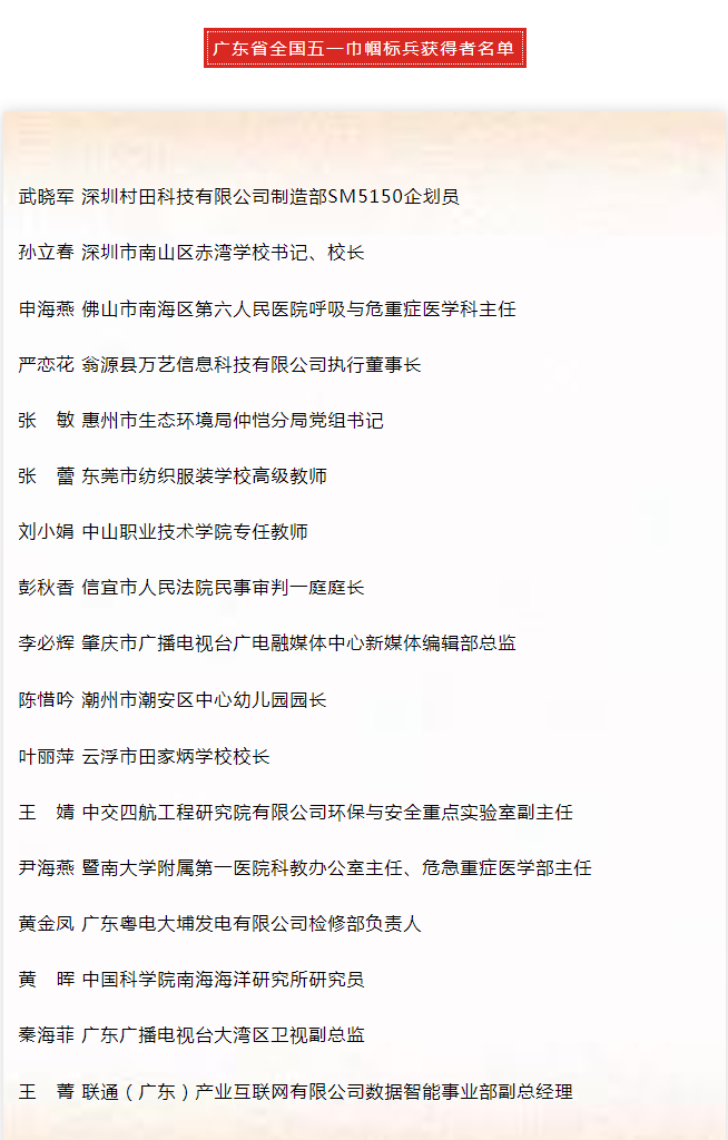 全國先進(jìn)女職工集體和個人每兩年評選表彰一次,該評選活動旨在大力弘揚勞模精神、勞動精神、工匠精神,鼓舞激勵廣大女職工在強(qiáng)國建設(shè)、民族復(fù)興新征程上更好的發(fā)揮“半邊天”作用。本次評選表彰中科院共3人、1集體榮獲全國五一巾幗標(biāo)兵、全國五一巾幗標(biāo)兵崗稱號。廣東省共有17個集體和17名個人榮獲全國五一巾幗標(biāo)兵崗、全國五一巾幗標(biāo)兵稱號。