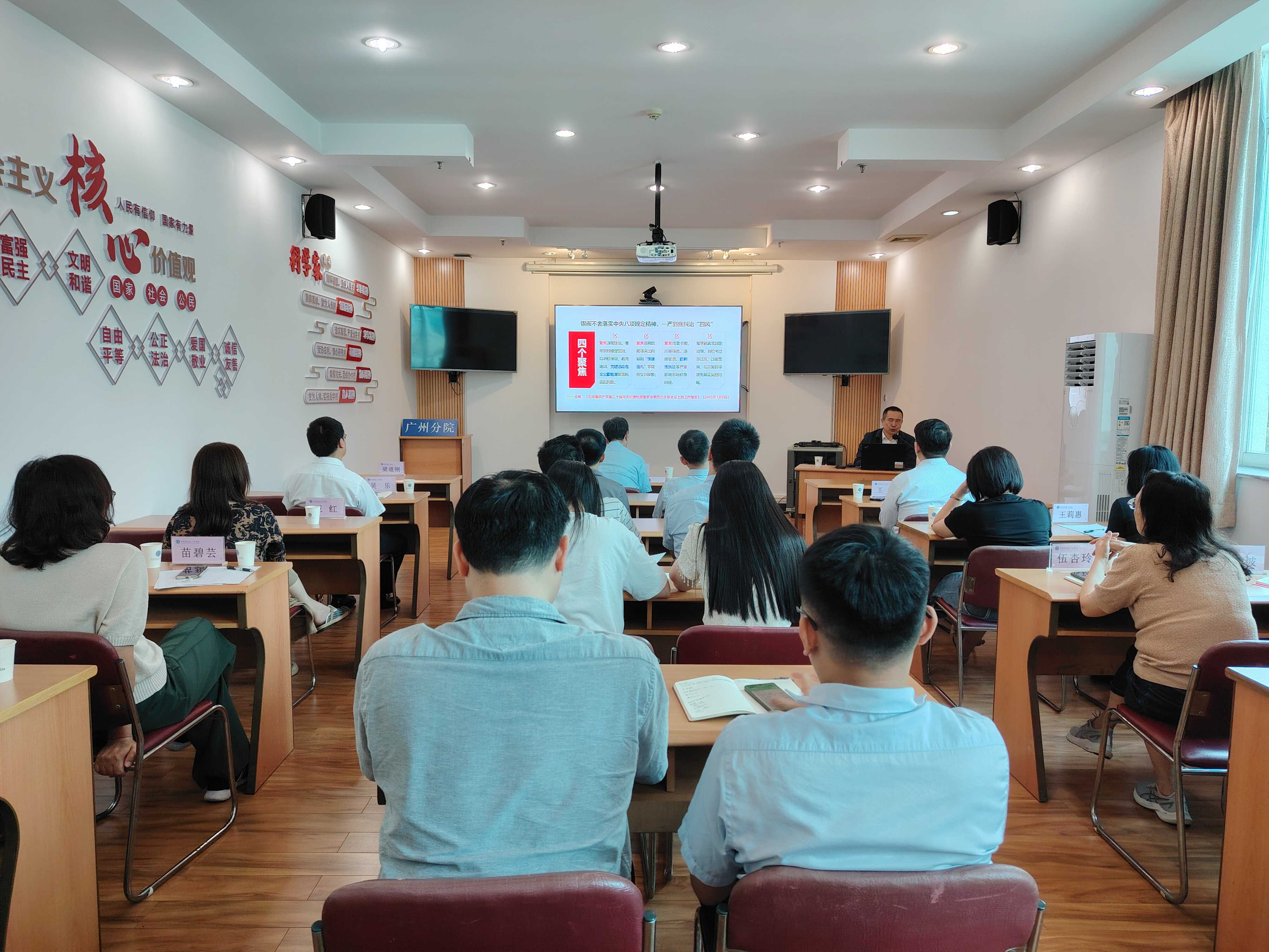 29日下午,舉辦深入貫徹中央八項規定精神學習教育讀書班。讀書班邀請廣東省委黨校黨建教研部主任梁道剛教授作《深入學習貫徹習近平總書記關于加強黨的作風建設的重要論述和中央八項規定精神》專題輔導報告。他以嚴謹的邏輯、鮮明的觀點、生動的案例對習近平總書記關于黨的作風建設的重要論述、中央八項規定及其實施細則精神的內涵要求進行了深刻的解讀,講明了為什么、是什么、怎么做等問題,有效幫助黨員干部進一步提高政治站位,準確把握中央八項規定精神的豐富內涵和實踐要求,警惕“四風”問題隱形變異,做好科技創新服務管理工作,助力實現高水平科技自立自強。機關全體黨員參加了讀書班。
