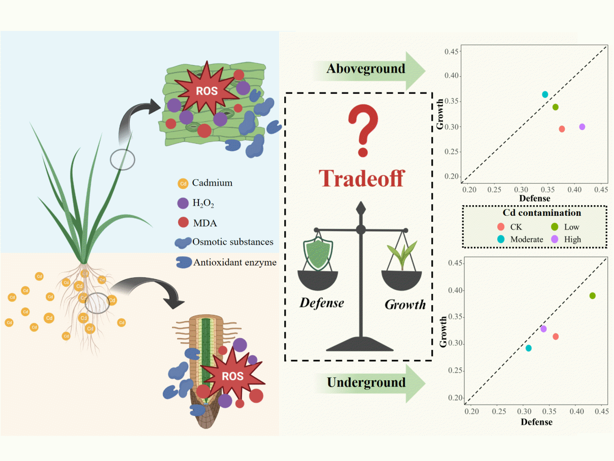 中國科學院華南植物園恢復生態學團隊成員以芒屬先鋒植物五節芒(Miscanthus floridulus)為研究對象,通過控制條件下的外源鎘脅迫實驗與野外尾礦庫原位調查相結合,系統探究了其“生長-防御”與“地上-地下”之間的資源權衡模式。研究發現,在外源鎘脅迫下,地上和地下部分的資源權衡模式表現不同;尤其在高濃度外源鎘脅迫下,地上組織偏向生長,而地下部分則轉向防御,顯示出組織間資源分配策略的重塑;此外,五節芒地下部分的權衡主要受植物Cd積累的影響,而地上部分的權衡則主要受植物過氧化氫的積累驅動(圖1)。在野外尾礦區原位實地研究發現,隨著土壤重金屬風險水平的升高,五節芒的資源權衡模式由地下向地上轉移,且這一過程與土壤元素組成、植物體內營養元素以及根際微生物群落密切相關(圖2)。研究結果不僅揭示了先鋒植物在重金屬污染環境中的適應性資源配置機制,為理解植物在重金屬脅迫下的生理和生化適應機制提供了新的視角;也為篩選和優化修復植物、提升植物修復效率提供了理論依據,對推動污染土地生態恢復具有重要意義。