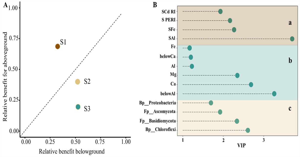 圖2. 重金屬風險下芒屬植物的地上地下權衡模式(A)及影響因素(B)