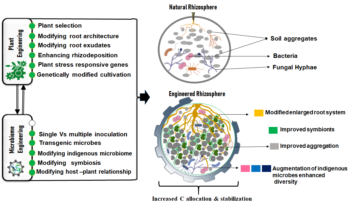 傳統(tǒng)的單一農(nóng)業(yè)種植模式依賴大量化肥和殺蟲劑的投入導(dǎo)致土壤質(zhì)量和微生物多樣性降低,最終損害長期可持續(xù)發(fā)展。相比之下,根際工程通過整合植物遺傳學(xué)、微生物群落調(diào)控和核酸技術(shù)創(chuàng)新(包括基因編輯與合成生物學(xué))來重構(gòu)植物-微生物-土壤相互作用,提供了一種變革性的解決方案。該方案有助于養(yǎng)分獲取、碳固存、病原體抑制和污染物去除。