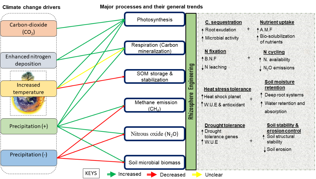 圖2. 氣候變化對農(nóng)業(yè)生態(tài)系統(tǒng)關(guān)鍵生物地球化學(xué)過程的影響,以及根際工程在?緩解土壤-植物-環(huán)境系統(tǒng)沖擊?中的作用機(jī)制