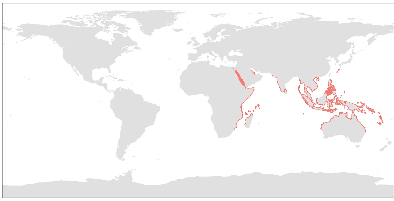 圖1 儒艮地理分布范圍(數(shù)據(jù)來(lái)源:國(guó)際自然保護(hù)聯(lián)盟瀕危物種紅色名錄)